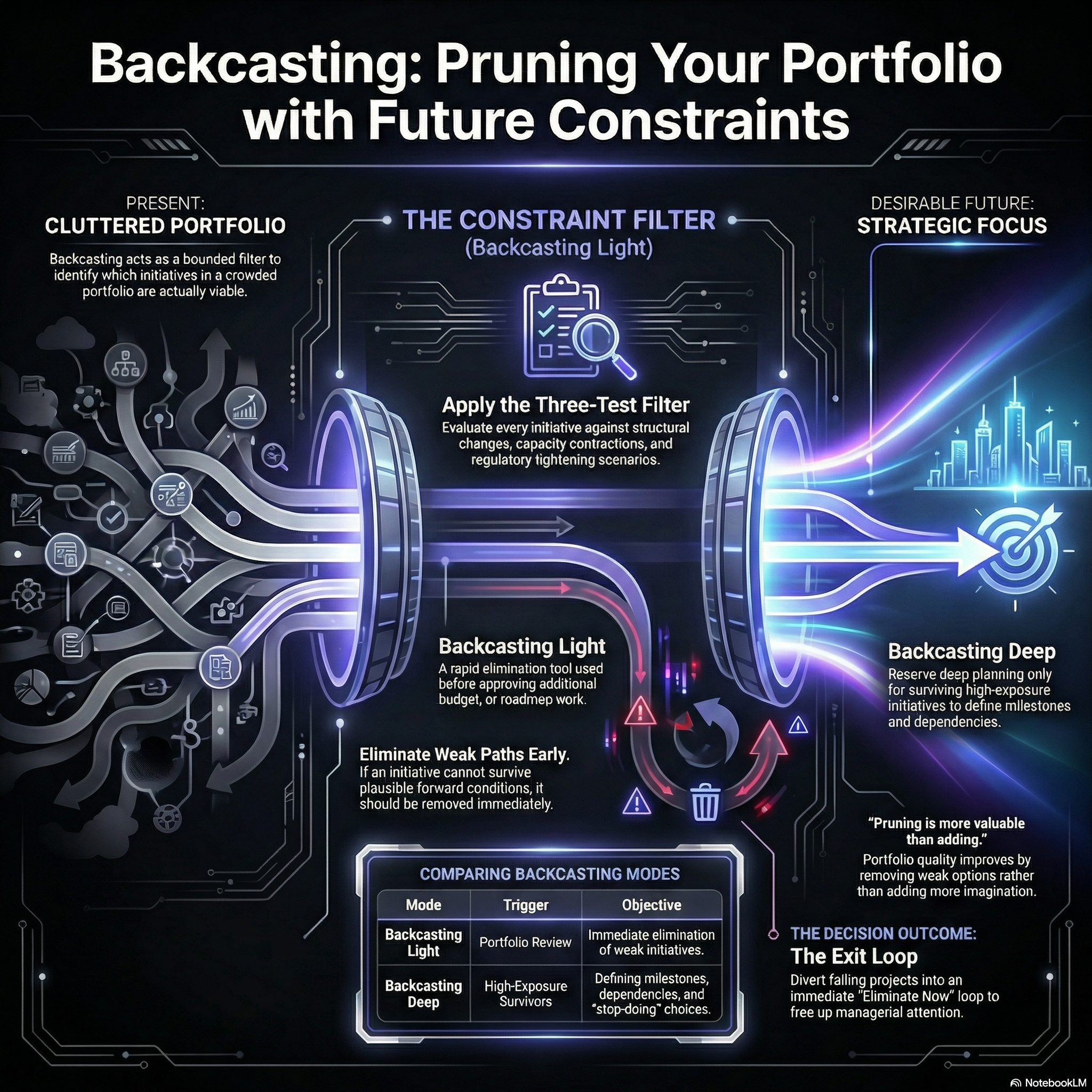 Most initiative portfolios are too full because they are filtered by enthusiasm, local sponsorship, or near-term logic alone. Backcasting, used inside First Exits, works as a pruning discipline: it tests whether an initiative still holds under credible future conditions before more time, budget, or managerial attention is committed.
